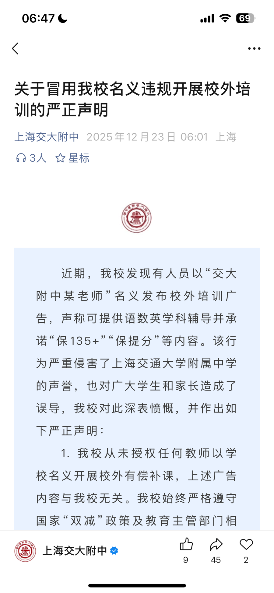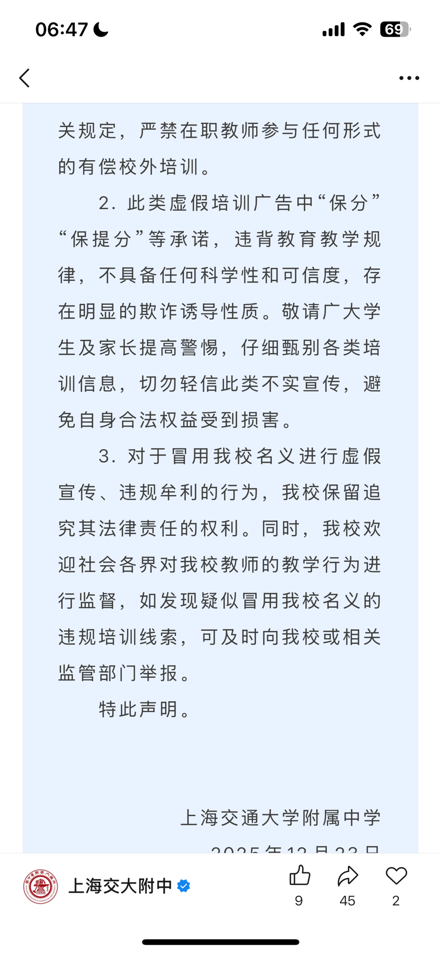 声明临了明确,关于冒用学校花样进行失实宣传、非法谋利的步履,上海交通大学附庸中学保留根究其法律牵累的权益。同期,学校接待社会各界对教师的造就步履进行监督,如发现疑似冒用校名的非法培训踪影,可实时向学校或关系监管部门举报。